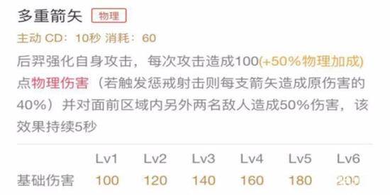 整体分析: 被动技能可以让后羿在普攻命中后增加攻速,可叠加数层,有上限。叠满后,三秒内普攻将会射出三支箭矢,每支箭矢的伤害比原伤害低。被动技能让后羿前期就可以快速叠加攻速,普攻打出范围攻击可以增加后羿的推线速度。打团时,如果敌方站位比较集中,可以打出大量伤害。