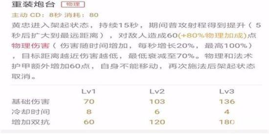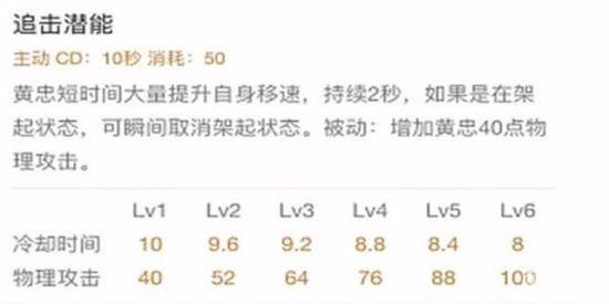 一技能是黄忠风筝敌人的核心技能。黄忠的基础移速较低,自身的灵活性全部依赖于一技能的加速。一技能可以取消大招的架起状态,所以在开启大招前一般都要保证一技能已经冷却完毕。被动可以提升黄忠的攻击力,能够大大增强黄忠的输出能力,所以在技能加点上主加一技能。