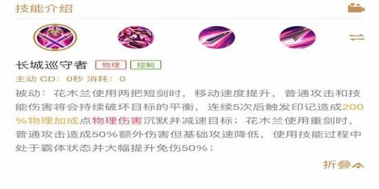 技能解析:花木兰使用两把短剑时,移动速度提升,普通攻击和技能伤害将会持续破坏目标的平衡,连续5次后触发印记造成物理伤害沉默并减速目标;花木兰使用重剑时,普通攻击造成50%额外伤害但基础攻速降低,使用技能过程中处于霸体状态并大幅提升免伤50%;