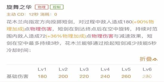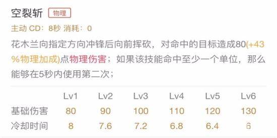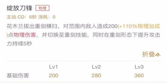 数值分析:双剑形态的一技能,基础伤害随着等级增加而提升,后期达到130,冷却达到了6秒,是花木兰的一个主要切入技能;重剑形态下一技能,蓄力时间越久伤害越高,是花木兰的一个主要输出技能。