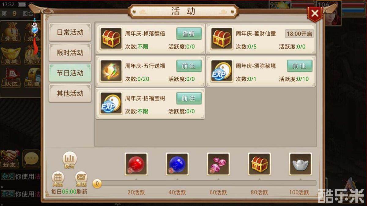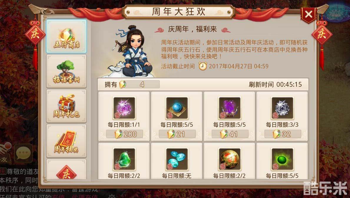 周年庆典期间,“五行送福”活动,完成修行、十绝阵、除暴、师门、降妖、伏魔日常任务,获得常规奖励时有几率额外获得周年庆独特的五行石道具,五行石可在周年狂欢界面-五行商店进行奖励兑换。限量周年法宠小道女“问羽”的碎片也将通过五行石兑换获得!参与条件:等级≥30,单人/组队,特别说明:五行石每人每天只能获得20个。