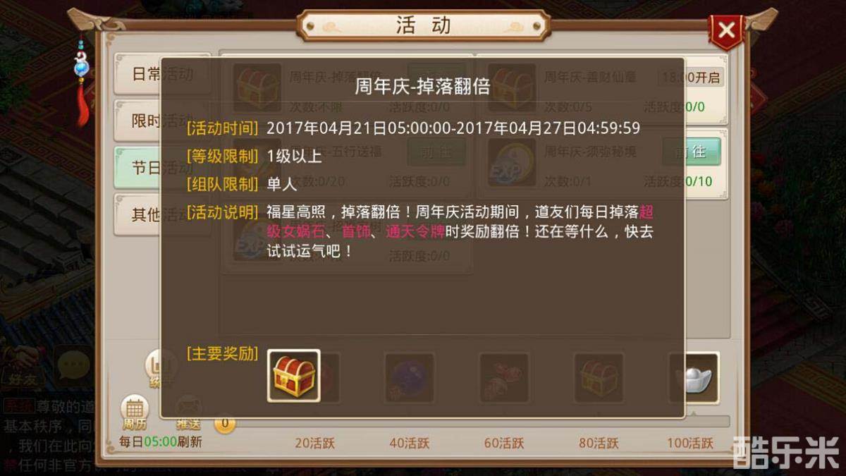 福星高照,掉落翻倍!在周年庆典期间,道友们每日在部分活动中将获得翻倍奖励,奖励包含超级女娲石、通天令牌和首饰。特别说明:当道友包裹已满时奖励会通过邮件发送,但只保留3天,道友务必记得每天检查自己的包裹空间和邮箱,以免错失奖励。