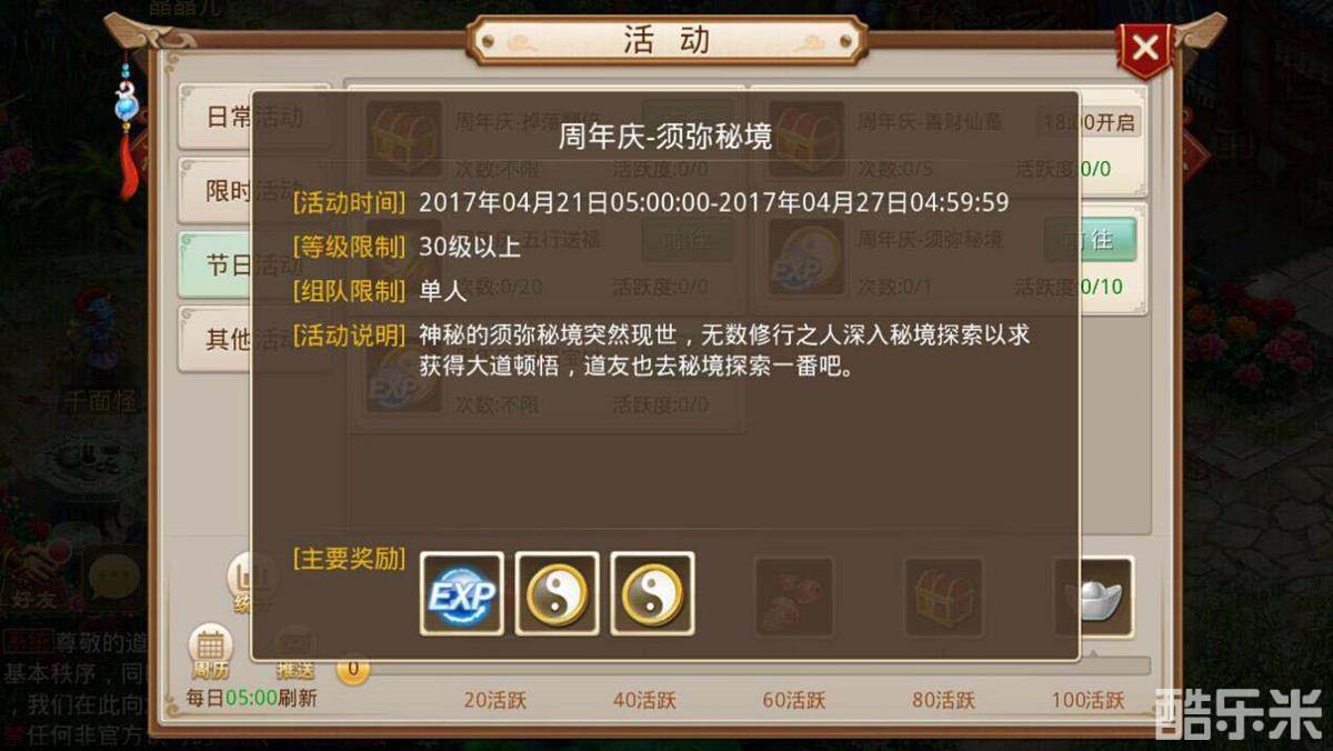 神秘的须弥秘境活动开启,无数修行之人深入秘境探索以求获得大道顿悟。道友们可以在NPC逍遥仙处了解情况,进入须弥秘境可通过探索宝箱,挑战守护者来获得经验、道行、宠物武学等奖励。