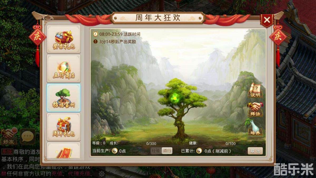 招福宝树,生财有道!活动期间各位道友在周年庆界面将获得一颗招福宝树,道友们可以通过培养宝树以获得更丰厚的奖励。培养过程中宝树还会随机触发害虫事件,道友需要及时除虫保证宝树的健康度喔。道友还可为他人的宝树浇水,每日前三次浇水可获得经验。