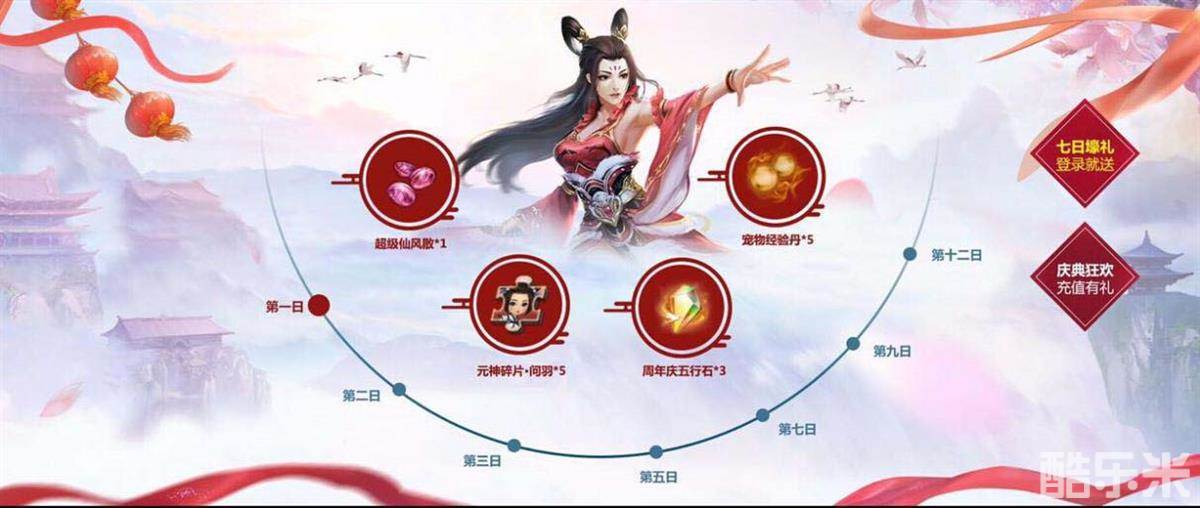 周年庆期间,从开服当天连续12天,玩家连续登录每天将收到礼包不重样的惊喜大礼,进入游戏即可领取!