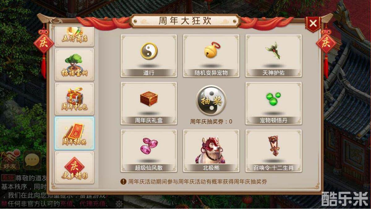 周年狂欢,鸿运当头!活动期间周年庆界面将出现周年抽奖大转盘,消耗周年庆抽奖券就可以获得一次抽奖机会,抽奖礼品涵盖宠物顿悟丹、召唤令·十二生肖、北极熊、随机变异宠、周年庆礼盒等重磅豪礼。