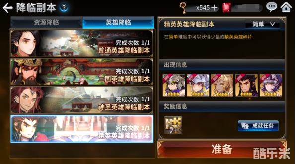 英雄降临的每个副本每天可以进入1次,分为普通英雄降临副本、三国英雄降临副本、神圣英雄降临副本、精英英雄降临副本。分别可以获得奖励为普通英雄碎片,三国英雄碎片,神圣英雄碎片和精英英雄碎片。