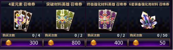 黄钻商场可购买4星七骑士召唤券/突破专用英雄券/6星装备强化用材料等。