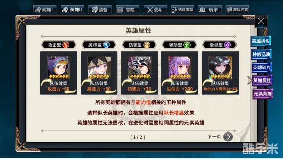 英雄分为攻击型、魔法型、防御型、辅助型、全能型五种属性。