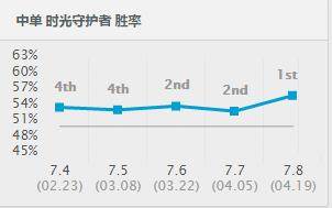 通过观察近几个版本下基兰的胜率走势,可以很明显的发现他的崛起并非是飞跃式的提升,相反胜率是呈阶段性的缓步上涨,直到7.8版本的到来才真正坐稳了韩服中单胜率的头名。