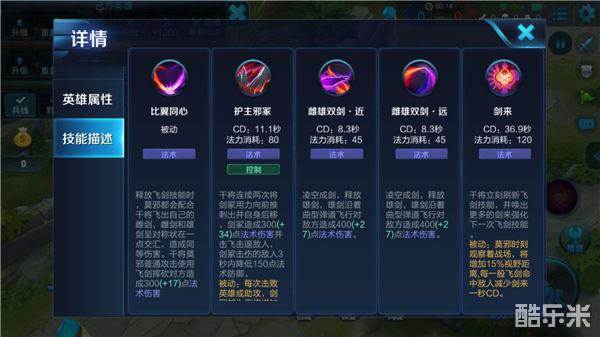 干将莫邪自改版后提高了技能命中的概率,经历每次的击败或是助攻,都能提升干将莫邪的法术强势,使其在后期能利用远程攻击轻松击败敌人,是一名十分恐怖的法师。
