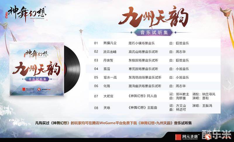 许多玩家在玩过《神舞幻想》后,通过各种渠道表达了对于游戏原声音乐集的期许。值此新春,收录了8首游戏经典配乐与歌曲的《神舞幻想•九州天韵》音乐试听集今日正式发布,作为新春贺岁版本外的又一份新年礼物,诚意送给支持和喜爱《神舞幻想》的玩家朋友!凡已拥有《神舞幻想》游戏的玩家,即日起都可在腾讯WeGame平台下载《神舞幻想•九州天韵》音乐试听集,愿九州儿女如《天咏》所唱一般,凝聚在一起,与爱为邻。