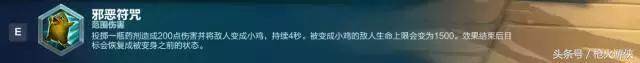 描 述:投掷一瓶药剂造成200点伤害并将敌人变成小鸡,持续4秒,被变成小鸡的敌人生命上限会变为1500,效果结束后目标会恢复成变身以前的状态