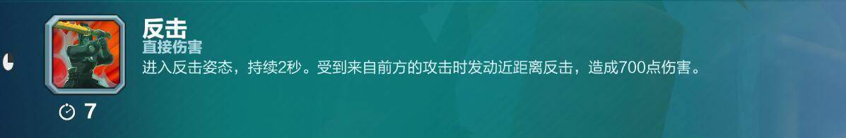 此卡特点作用于右键的反击,被打到反击后仍然保持反击的姿态2秒,2秒内如果对方一直在打你或者说你的前方有火力碰到你的格挡,你会在这2秒内一直反击你前方的人造成多次700的伤害。如果配合上我们前面说的卡组反击成功回复100血,最多可以点到400,那么反击一次你可以回复400的血。