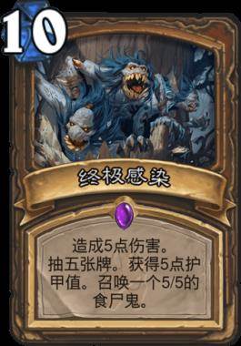 终极感染——无论在哪方面都碾压加基森拍卖师,他不需要combo,还能抽5张卡,还有个5血的怪站着,还回了护甲,还造成了伤害。怎么看都比加基森强很多,还不需要牌序。这张卡还使得滋养更有价值了,你不用滋养来过牌了,直接用它来跳费,因为你可以提前两回合用终极感染来充实你的手牌。