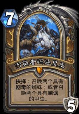 污染者玛法里奥——德鲁伊的DK英雄卡对于所有慢速德鲁伊卡组来说都很好,他不是必须卡,但是对很多卡组适应性都很好,不仅仅是你可以在打出时召唤嘲讽或者剧毒的虫子(尽管两者都很强力),你也可以选择加3攻或者加3护甲,取决于你的对手是什么类型,你可以选择进攻或者防御。不像艾雅或者终极感染这样核心,但是确实对胜率提高有所帮助。