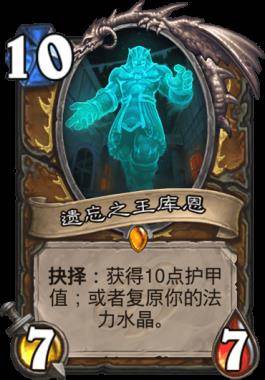 遗忘之王库恩——仅仅当有终极感染时使用,由于终极感染需要大量跳费,获得10点法力值并不是那么难,然后你就多了一个7/7站场,这样可以一回合带来巨大压力,比如王库恩加终极感染或者几个青玉魔像,也可以用他来恢复10点护甲,比如你对阵快攻时快被打死之前。