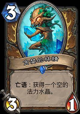贪婪的林精——替换泥潭守护者,笔者比较喜欢泥潭守护者,1血太容易被清掉了,亡语又不是及时生效的,等到泥潭守护者和青玉绽放退环境以后可以加入这张牌(或者我们有新的跳费选择)。
