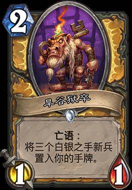 这套牌在新版本没有获得太多增强,旱谷狱卒是唯一能加入这套牌的蓝白卡,虽然1/1的身材并不是很强,但是它会给你手牌增加3个报告兵,能够充实你被buff的目标。污手骑最讨厌没有手牌了,如果手里只有1-2个随从,那buff也没什么意义,旱谷狱卒可以弥补这一点,3个报告看起来普普通通,但是如果被风驰电掣这样的牌buff过后,怎么说也能在场上召唤一地的3/3吧。