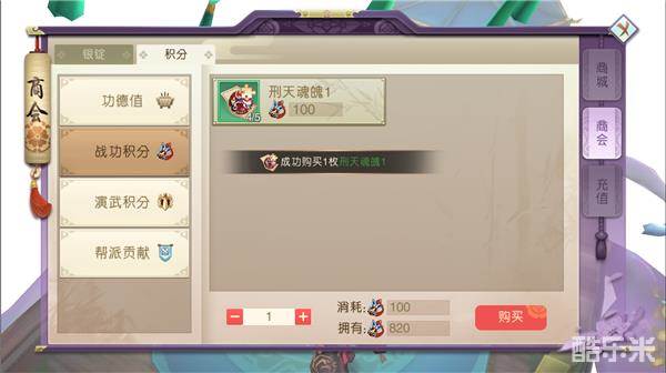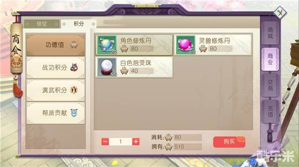 这其中,大人们可以通过帮助等级较低的玩家完成特定的任务来获取功德值,战功积分可以通过阵营战玩法来获得,演武积分则可以通过演武场玩法来获得,帮派贡献则可以通过帮派任务来获得,除此之外,在帮派中帮助提交其他伙伴许愿的物品,也是可以获得帮派贡献值的。大人们获得了相应足够的贡献值后,在商会进行购买,就可以在背包中获得之前兑换的物品了。