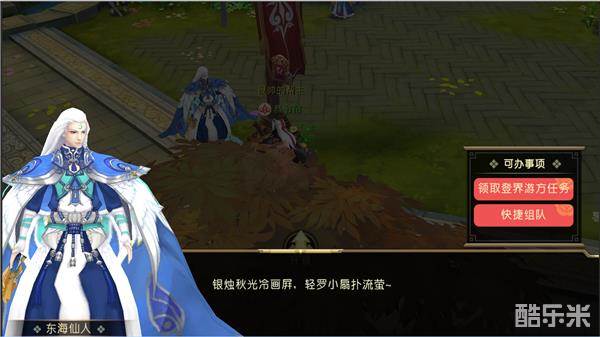 登界游方任务的领取NPC为洛阳城的东海仙人,登界游方任务包含闲聊、战斗、捐物等类型,大人们在接取任务后,从任务库中随机选取三环任务作为一组,完成了一组后可刷新出下一组。