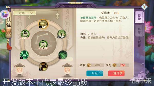 祭风术:单体普攻技能,借风神之力攻击1名敌人,附加自身一定治疗强度比例的伤害。