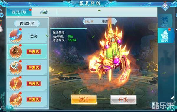 器灵系统可激活大量器灵,提升战力属性,激活需要满足激活条件,激活成功后可使用器灵丹升级,魂器和器灵达到一定等级后才能激活器灵技能槽,器灵丹可由战役奖励获得。