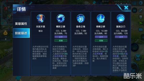 川流不息:被动能增加大乔与周围友军的移速,并且随着英雄等级增加而成长。此技能让大乔能够快速帮助队友逃离战场。