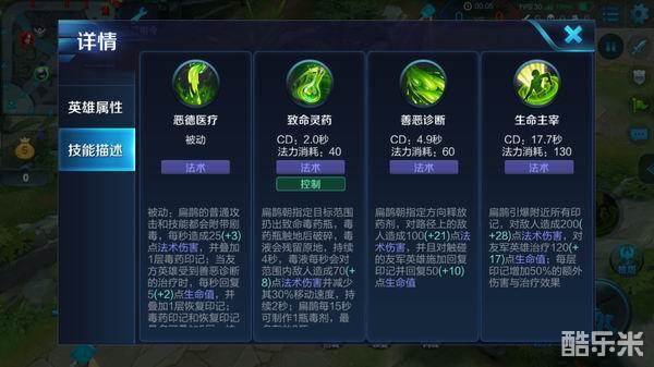 恶德医疗:被动让扁鹊的普攻和技能都会附带持续伤害,并且能够叠加伤害。同时也能持续为队友回复血量,并叠加印记。玩扁鹊就要不断的叠加印记,叠满后再引爆的效果会十分惊人。