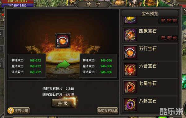 宝石可使用宝石碎片提升等级,宝石碎片可通过打怪掉落,各种活动或商场购买等方式获得。宝石可全面提升人物属性,宝石等级越高可为人物提供更高的属性加成