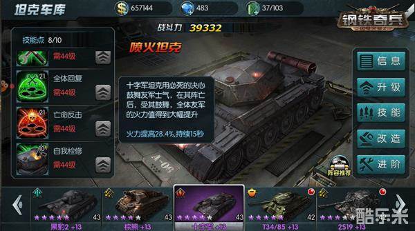 游戏中每辆坦克都有四个技能。随着坦克等级的提升,会依次解锁不同的技能。坦克技能解锁以后就可以升级坦克技能,但是技能等级也会受到坦克等级的影响,你懂的,不能超过坦克等级啦!升级坦克技能可以提高技能的属性值。比如“十字军”坦克的第三个技能“亡命反击”,技能描述为“十字军坦克用必死的决心鼓舞友军士气,在其阵亡后,受其鼓舞,全部友军的火力值得到大幅提升”,提升该技能可以提高火力提升百分比。顺便一提“十字军”坦克是《闪电突袭2-钢铁奇兵》中经典的“奶妈”属性坦克,回血能力敲厉害,指挥官们记得要入手哦!