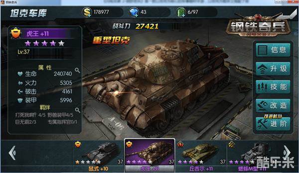 进阶:需要使用进阶道具,关卡有掉落,作用是提高坦克生命值、输出值等。显示为坦克名称右边的“+n”。如11阶的虎王,就显示虎王+11。