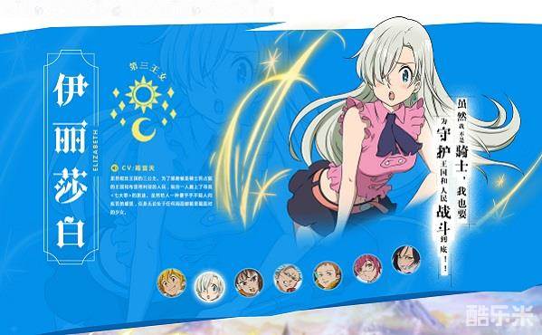 里昂妮丝王国的三公主。为了拯救被圣骑士所占据的王国和布里塔利亚的人民,独自一人踏上了寻找<七大罪>的旅途。虽然给人一种傻乎乎不知人间疾苦的感觉,但是无论处于任何局面都能坚强面对的,充满了爱与信念的少女。