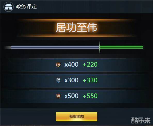 其三,政务明公每天可完成5次政务,但老臣要说的是,政务有一个评定系统,如果明公只完成政务要求的份额将只能拿到基本奖励,明公若完成远超要求的份额,将可拿到额外的经验和功勋,上图政务要求提升2点安定,老臣完成了14点,下图绿色数字为额外的奖励