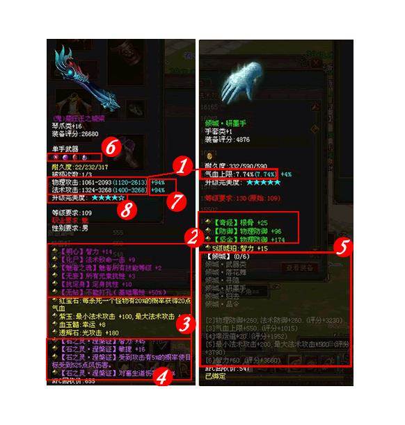 3、宝石镶嵌,宝石镶嵌到带孔的装备上,会产生特定的属性,其中右图6处是宝石镶嵌的位置。[宝石介绍]
