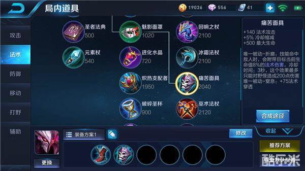 痛苦面具增加的最大生命使干将莫邪的生存能力提高,减少的技能CD时间与冷静之靴减少的技能时间结合起来,可以让干将莫邪更加迅速的释放技能,增加的法术攻击使干将莫邪的技能伤害变得极为恐怖,被动效果让干将莫邪的技能在命中敌人之后,可以对其造成一定百分比的附加伤害,在一定程度上能够将敌人快速的击杀。