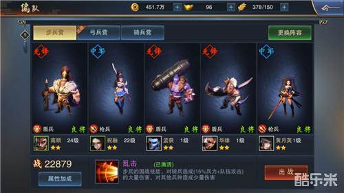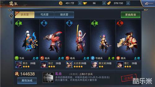 这套阵容可是上面阵容的全方位升级版,首先在等级上基本全为三星、四星级的武将,在我们追求完整阵容的原则下,这套武将搭配仍然是很好的体现了铁三角的关系。曹仁的八门金锁阵作为群体增加护盾的技能,是团队的保护伞,张辽、太史慈是团队的主要输出,在曹仁的背后与敌方短兵相接,而黄忠实则是这套阵容的核心输出,凭借着弓兵射程远的天然优势,黄忠可以非常安心的阵容后方持续输出,蔡文姬虽然是一个二星武将,但是她的胡笳袅袅能够有效的弥补这个阵容内缺少奶妈的短板,群体护盾加成攻击力增益的BUFF,能够最大程度上帮助这套阵容打出伤害。