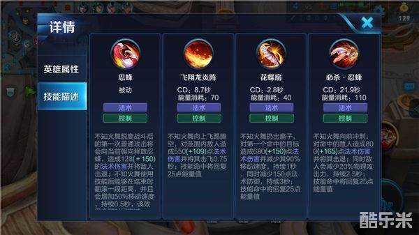 被动技能——忍蜂:被动技能让不知火舞具有较高的机动性,使不知火舞在施放技能后可以调整自身的走位,进可攻退可守。除此之外被动技能让不知火舞在脱战后拥有更强的输出和控制能力。