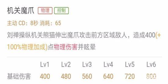 数据分析:虽然此技能有着可观的伤害与高额的物理加成,但由于刘禅通常在团队中是承担坦克的作用,因此优先级还是主点一技能,二技能推荐次加。