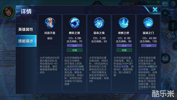 一技能:鲤跃之潮,大乔召唤鲤鱼向指定方向跳跃,对于路径上的敌人造成很高法术伤害与击退效果,鲤鱼经过的区域会在一段时间内持续增加区域内友军的移动速度。