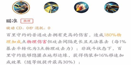 百里守约的脱战贴墙行动支援能力会更强,初期16%移速加成让其更快赶到目的地,且会贴墙脱战状态下会获得伪装效果来躲避敌人的普攻锁定或是单体选中技能。百里守约作为射手的独特点是其普攻伤害更高但攻击间隔更长,其无法暴击但会以1:3形式转化为攻击力,所以一些带有暴击率的装备同样会适合百里守约,一定的攻速能让百里守约的普A更加流畅。