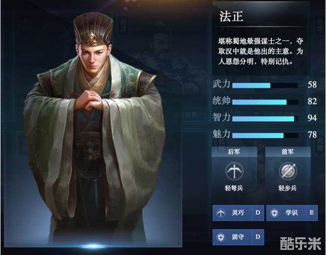 在《三十六计》中法正的定位属于前排英雄,初始拥有3技能,灵巧、学识、固守,可配备前排盾兵和后排弩兵,思维属性相对其他武将平均较低,但是智力属性很高,属于不错的前排英雄!