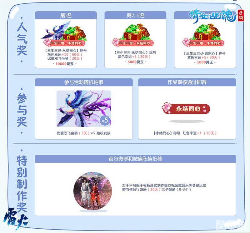 对于活动的参赛者,倩女手游准备了丰富多彩的奖励。作品通过审核即可获得【永结同心】称号、红色幸运+1;人气奖获得者,将能够获得【三生三世,永结同心】称号,第一名还有粉色幸运+10、比翼双飞坐骑与10000灵玉相赠!另外,活动还将随机抽取五名幸运玩家,送上永结同心坐骑!另外在官方微信、微博上投稿视频、音乐的参赛者也能够获得侠侣行翅膀作为奖励!