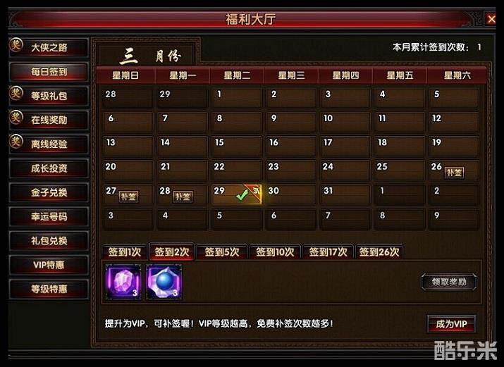 1、每日签到:玩家每日登陆可以签到一次,本月内累计签到一定次数可以获得物品奖励。玩家可花费元宝补签来挽回累计签到次数,VIP玩家可免费补签。