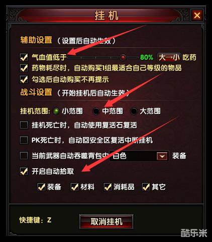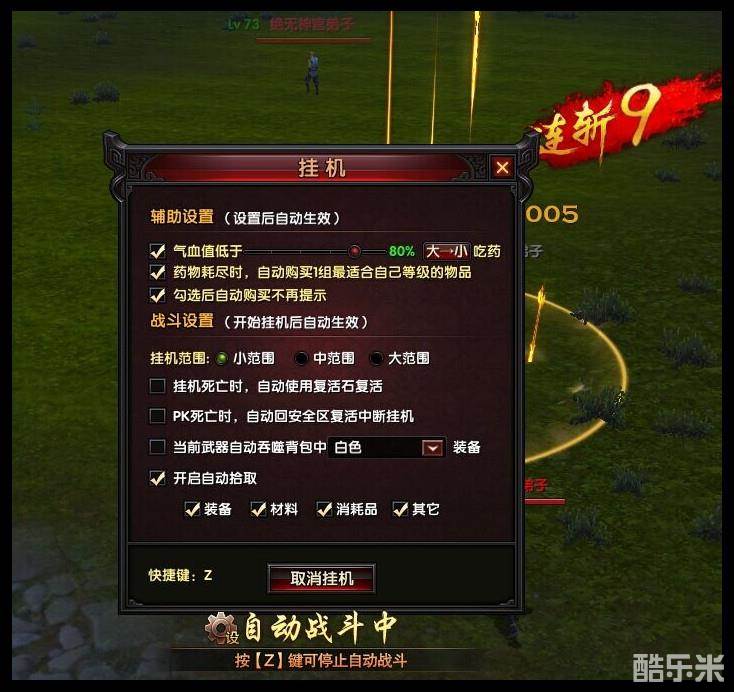自动复活:挂机死亡时,自动使用复活石复活,PK死亡时,自动回到安全区中复活中断挂机