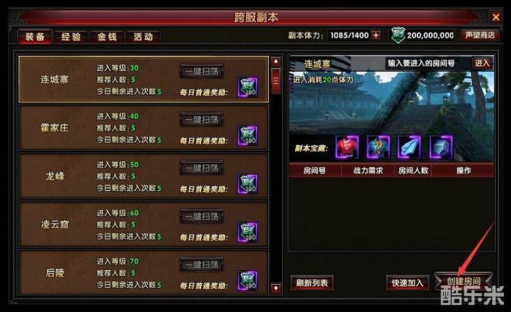 连城寨:30级开放,几率获得20级紫色装备,40级未鉴定装备