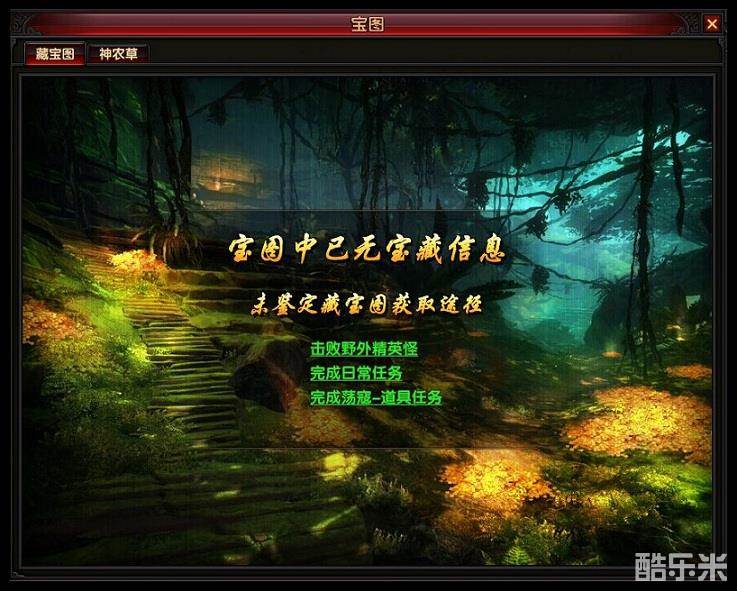 首次打开宝图界面,你会看到没有宝藏信息,这是因为你需要先获取藏宝图,藏宝图的来源有很多,击败野外精英怪、完成日常任务、完成荡寇道具任务等,都有机会获得藏宝图