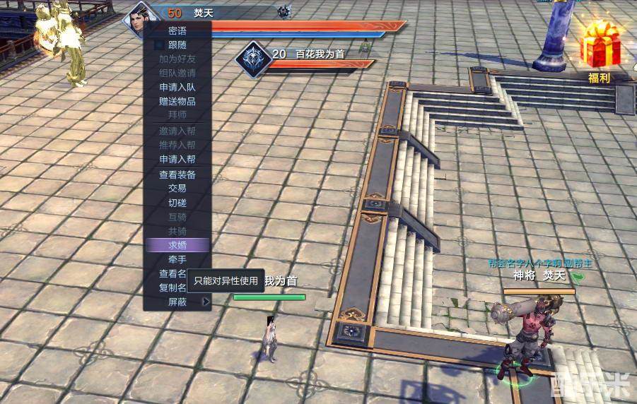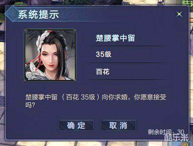 玩家达到20级时,可向异性玩家求婚,男性角色或女性角色任一方发起均可。发起求婚前需要选中对象后,使用右键菜单中的“求婚”功能。待对方收到提示确认同意,则求婚成功。