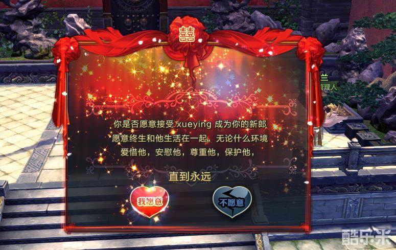已经订婚的二人,在锦城“婚事管理人·锡兰”处申请结婚服务,双方均选择“我愿意”后,正式成为夫妻,同时播放滚屏广播。若有任意一方玩家点击“不愿意”,则此次结婚申请失败。
