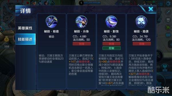 秘技·极意:兰陵王的被动是其朝敌方英雄移动时能够增加自身的移动速度。被动技能很好地提高了兰陵王的偷袭能力。